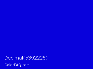 Decimal 5392228 Color is a normal indigo color and the nearest color is Medium Blue #0000cd. Hex code #0801dc and RGB value is rgb(8,1,220). In RGB color space, this color is composed of 3% red, 0% green, 86% blue, In CMYK color space, this color is composed of 96% cyan, 100% magenta, 0% yellow , 14% black , In HSL color space, this color has a hue angle of 242° , 99% saturation and 43% lightness.