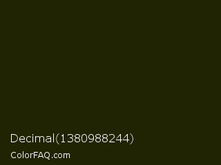 Decimal 1380988244 Color is a almost black yellow color and the nearest color is Pine Tree #171f04. Hex code #212402 and RGB value is rgb(33,36,2). In RGB color space, this color is composed of 13% red, 14% green, 1% blue, In CMYK color space, this color is composed of 8% cyan, 0% magenta, 94% yellow , 86% black , In HSL color space, this color has a hue angle of 65° , 89% saturation and 7% lightness.
