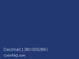 Decimal 1381009286 Color is a dark blue color and the nearest color is Astronaut #283a77. Hex code #213872 and RGB value is rgb(33,56,114). In RGB color space, this color is composed of 13% red, 22% green, 45% blue, In CMYK color space, this color is composed of 71% cyan, 51% magenta, 0% yellow , 55% black , In HSL color space, this color has a hue angle of 223° , 55% saturation and 29% lightness.