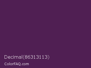 Decimal 86313113 Color is a very dark magenta color and the nearest color is Bossanova #4e2a5a. Hex code #501f53 and RGB value is rgb(80,31,83). In RGB color space, this color is composed of 31% red, 12% green, 33% blue, In CMYK color space, this color is composed of 4% cyan, 63% magenta, 0% yellow , 67% black , In HSL color space, this color has a hue angle of 297° , 46% saturation and 22% lightness.