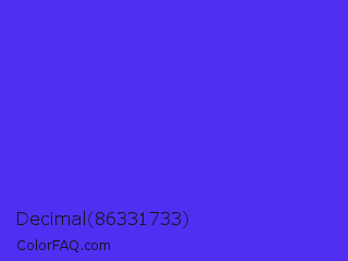 Decimal 86331733 Color is a normal indigo color and the nearest color is Han Purple #5218fa. Hex code #502ff3 and RGB value is rgb(80,47,243). In RGB color space, this color is composed of 31% red, 18% green, 95% blue, In CMYK color space, this color is composed of 67% cyan, 81% magenta, 0% yellow , 5% black , In HSL color space, this color has a hue angle of 250° , 89% saturation and 57% lightness.