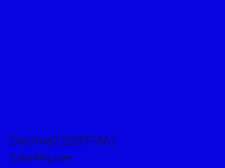 Decimal 5395766 Color is a normal indigo color and the nearest color is Medium Blue #0000cd. Hex code #0804e0 and RGB value is rgb(8,4,224). In RGB color space, this color is composed of 3% red, 2% green, 88% blue, In CMYK color space, this color is composed of 96% cyan, 98% magenta, 0% yellow , 12% black , In HSL color space, this color has a hue angle of 241° , 96% saturation and 45% lightness.
