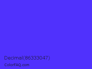 Decimal 86333047 Color is a normal indigo color and the nearest color is Han Purple #5218fa. Hex code #5031fd and RGB value is rgb(80,49,253). In RGB color space, this color is composed of 31% red, 19% green, 99% blue, In CMYK color space, this color is composed of 68% cyan, 81% magenta, 0% yellow , 1% black , In HSL color space, this color has a hue angle of 249° , 98% saturation and 59% lightness.