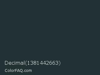 Decimal 1381442663 Color is a very dark cyan color and the nearest color is Medium Jungle Green #1c352d. Hex code #223133 and RGB value is rgb(34,49,51). In RGB color space, this color is composed of 13% red, 19% green, 20% blue, In CMYK color space, this color is composed of 33% cyan, 4% magenta, 0% yellow , 80% black , In HSL color space, this color has a hue angle of 187° , 20% saturation and 17% lightness.
