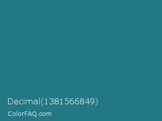 Decimal 1381566849 Color is a normal cyan color and the nearest color is Elm #1c7c7d. Hex code #227985 and RGB value is rgb(34,121,133). In RGB color space, this color is composed of 13% red, 47% green, 52% blue, In CMYK color space, this color is composed of 74% cyan, 9% magenta, 0% yellow , 48% black , In HSL color space, this color has a hue angle of 187° , 59% saturation and 33% lightness.