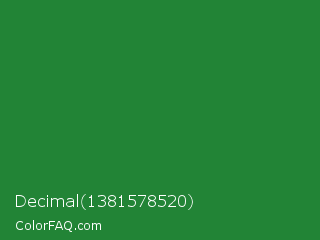 Decimal 1381578520 Color is a normal green color and the nearest color is Forest Green #228b22. Hex code #228436 and RGB value is rgb(34,132,54). In RGB color space, this color is composed of 13% red, 52% green, 21% blue, In CMYK color space, this color is composed of 74% cyan, 0% magenta, 59% yellow , 48% black , In HSL color space, this color has a hue angle of 132° , 59% saturation and 33% lightness.
