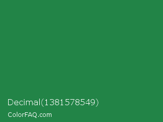 Decimal 1381578549 Color is a normal green color and the nearest color is Sea Green #2e8b57. Hex code #228447 and RGB value is rgb(34,132,71). In RGB color space, this color is composed of 13% red, 52% green, 28% blue, In CMYK color space, this color is composed of 74% cyan, 0% magenta, 46% yellow , 48% black , In HSL color space, this color has a hue angle of 143° , 59% saturation and 33% lightness.