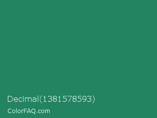 Decimal 1381578593 Color is a normal green color and the nearest color is Eucalyptus #278a5b. Hex code #228461 and RGB value is rgb(34,132,97). In RGB color space, this color is composed of 13% red, 52% green, 38% blue, In CMYK color space, this color is composed of 74% cyan, 0% magenta, 27% yellow , 48% black , In HSL color space, this color has a hue angle of 159° , 59% saturation and 33% lightness.