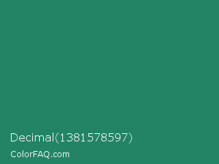 Decimal 1381578597 Color is a normal green color and the nearest color is Eucalyptus #278a5b. Hex code #228465 and RGB value is rgb(34,132,101). In RGB color space, this color is composed of 13% red, 52% green, 40% blue, In CMYK color space, this color is composed of 74% cyan, 0% magenta, 23% yellow , 48% black , In HSL color space, this color has a hue angle of 161° , 59% saturation and 33% lightness.