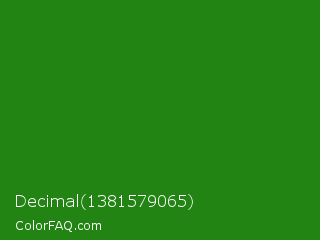Decimal 1381579065 Color is a dark green color and the nearest color is Forest Green #228b22. Hex code #228513 and RGB value is rgb(34,133,19). In RGB color space, this color is composed of 13% red, 52% green, 7% blue, In CMYK color space, this color is composed of 74% cyan, 0% magenta, 86% yellow , 48% black , In HSL color space, this color has a hue angle of 112° , 75% saturation and 30% lightness.