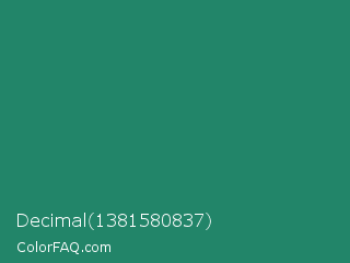 Decimal 1381580837 Color is a normal green color and the nearest color is Eucalyptus #278a5b. Hex code #228569 and RGB value is rgb(34,133,105). In RGB color space, this color is composed of 13% red, 52% green, 41% blue, In CMYK color space, this color is composed of 74% cyan, 0% magenta, 21% yellow , 48% black , In HSL color space, this color has a hue angle of 163° , 59% saturation and 33% lightness.