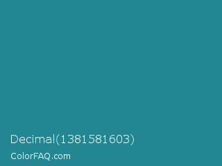 Decimal 1381581603 Color is a normal cyan color and the nearest color is Jelly Bean #297b9a. Hex code #228693 and RGB value is rgb(34,134,147). In RGB color space, this color is composed of 13% red, 53% green, 58% blue, In CMYK color space, this color is composed of 77% cyan, 9% magenta, 0% yellow , 42% black , In HSL color space, this color has a hue angle of 187° , 62% saturation and 35% lightness.