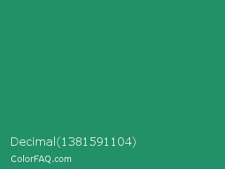 Decimal 1381591104 Color is a normal green color and the nearest color is Eucalyptus #278a5b. Hex code #229068 and RGB value is rgb(34,144,104). In RGB color space, this color is composed of 13% red, 56% green, 41% blue, In CMYK color space, this color is composed of 76% cyan, 0% magenta, 28% yellow , 44% black , In HSL color space, this color has a hue angle of 158° , 62% saturation and 35% lightness.