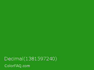 Decimal 1381597240 Color is a normal green color and the nearest color is Slimy Green #299617. Hex code #229516 and RGB value is rgb(34,149,22). In RGB color space, this color is composed of 13% red, 58% green, 9% blue, In CMYK color space, this color is composed of 77% cyan, 0% magenta, 85% yellow , 42% black , In HSL color space, this color has a hue angle of 114° , 74% saturation and 34% lightness.
