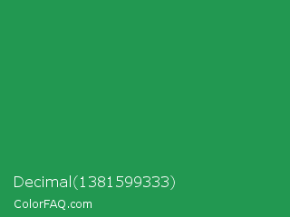 Decimal 1381599333 Color is a normal green color and the nearest color is Eucalyptus #278a5b. Hex code #229851 and RGB value is rgb(34,152,81). In RGB color space, this color is composed of 13% red, 60% green, 32% blue, In CMYK color space, this color is composed of 78% cyan, 0% magenta, 47% yellow , 40% black , In HSL color space, this color has a hue angle of 144° , 63% saturation and 36% lightness.