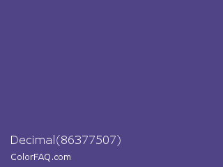 Decimal 86377507 Color is a normal indigo color and the nearest color is Victoria #534491. Hex code #504487 and RGB value is rgb(80,68,135). In RGB color space, this color is composed of 31% red, 27% green, 53% blue, In CMYK color space, this color is composed of 41% cyan, 50% magenta, 0% yellow , 47% black , In HSL color space, this color has a hue angle of 251° , 33% saturation and 40% lightness.