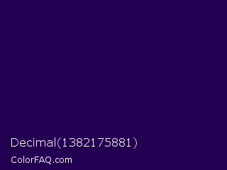 Decimal 1382175881 Color is a very dark violet color and the nearest color is Cherry Pie #2a0359. Hex code #230051 and RGB value is rgb(35,0,81). In RGB color space, this color is composed of 14% red, 0% green, 32% blue, In CMYK color space, this color is composed of 57% cyan, 100% magenta, 0% yellow , 68% black , In HSL color space, this color has a hue angle of 266° , 100% saturation and 16% lightness.