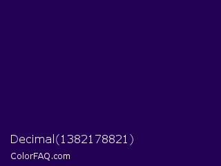 Decimal 1382178821 Color is a very dark violet color and the nearest color is Cherry Pie #2a0359. Hex code #230255 and RGB value is rgb(35,2,85). In RGB color space, this color is composed of 14% red, 1% green, 33% blue, In CMYK color space, this color is composed of 59% cyan, 98% magenta, 0% yellow , 67% black , In HSL color space, this color has a hue angle of 264° , 95% saturation and 17% lightness.