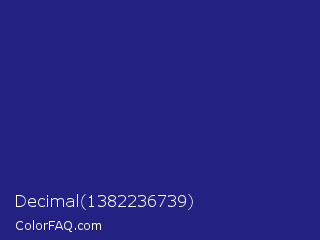 Decimal 1382236739 Color is a normal indigo color and the nearest color is Jacksons Purple #20208d. Hex code #232283 and RGB value is rgb(35,34,131). In RGB color space, this color is composed of 14% red, 13% green, 51% blue, In CMYK color space, this color is composed of 73% cyan, 74% magenta, 0% yellow , 49% black , In HSL color space, this color has a hue angle of 241° , 59% saturation and 32% lightness.