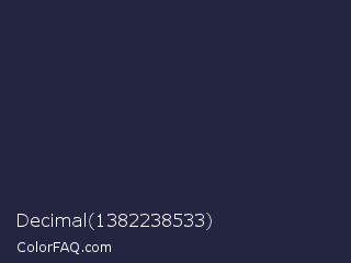 Decimal 1382238533 Color is a very dark blue color and the nearest color is Ebony Clay #26283b. Hex code #232541 and RGB value is rgb(35,37,65). In RGB color space, this color is composed of 14% red, 15% green, 25% blue, In CMYK color space, this color is composed of 46% cyan, 43% magenta, 0% yellow , 75% black , In HSL color space, this color has a hue angle of 236° , 30% saturation and 20% lightness.