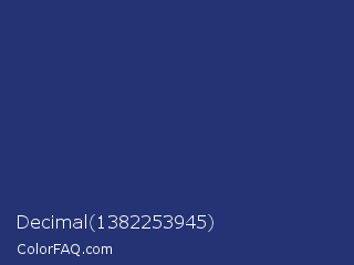Decimal 1382253945 Color is a dark blue color and the nearest color is Astronaut #283a77. Hex code #233373 and RGB value is rgb(35,51,115). In RGB color space, this color is composed of 14% red, 20% green, 45% blue, In CMYK color space, this color is composed of 70% cyan, 56% magenta, 0% yellow , 55% black , In HSL color space, this color has a hue angle of 228° , 53% saturation and 29% lightness.