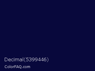 Decimal 5399446 Color is a very dark blue color and the nearest color is Deep Cove #051040. Hex code #08083c and RGB value is rgb(8,8,60). In RGB color space, this color is composed of 3% red, 3% green, 24% blue, In CMYK color space, this color is composed of 87% cyan, 87% magenta, 0% yellow , 76% black , In HSL color space, this color has a hue angle of 240° , 76% saturation and 13% lightness.