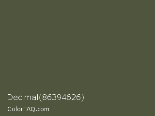 Decimal 86394626 Color is a dark lime color and the nearest color is Gray Asparagus #465945. Hex code #50553e and RGB value is rgb(80,85,62). In RGB color space, this color is composed of 31% red, 33% green, 24% blue, In CMYK color space, this color is composed of 6% cyan, 0% magenta, 27% yellow , 67% black , In HSL color space, this color has a hue angle of 73° , 16% saturation and 29% lightness.