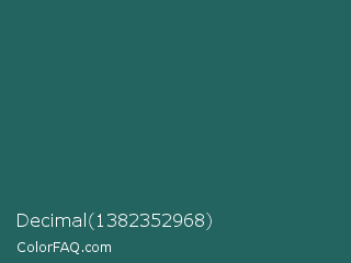 Decimal 1382352968 Color is a dark cyan color and the nearest color is Casal #2f6168. Hex code #236360 and RGB value is rgb(35,99,96). In RGB color space, this color is composed of 14% red, 39% green, 38% blue, In CMYK color space, this color is composed of 65% cyan, 0% magenta, 3% yellow , 61% black , In HSL color space, this color has a hue angle of 177° , 48% saturation and 26% lightness.