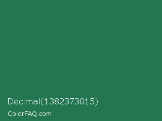 Decimal 1382373015 Color is a dark green color and the nearest color is Dark Spring Green #177245. Hex code #237651 and RGB value is rgb(35,118,81). In RGB color space, this color is composed of 14% red, 46% green, 32% blue, In CMYK color space, this color is composed of 70% cyan, 0% magenta, 31% yellow , 54% black , In HSL color space, this color has a hue angle of 153° , 54% saturation and 30% lightness.