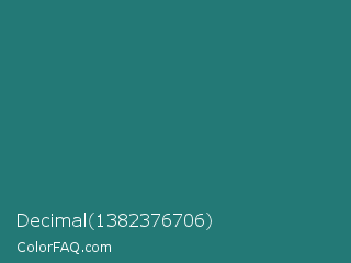 Decimal 1382376706 Color is a normal cyan color and the nearest color is Elm #1c7c7d. Hex code #237976 and RGB value is rgb(35,121,118). In RGB color space, this color is composed of 14% red, 47% green, 46% blue, In CMYK color space, this color is composed of 71% cyan, 0% magenta, 2% yellow , 53% black , In HSL color space, this color has a hue angle of 178° , 55% saturation and 31% lightness.