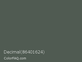 Decimal 86401624 Color is a normal green color and the nearest color is Feldgrau #4d5d53. Hex code #505b52 and RGB value is rgb(80,91,82). In RGB color space, this color is composed of 31% red, 36% green, 32% blue, In CMYK color space, this color is composed of 12% cyan, 0% magenta, 10% yellow , 64% black , In HSL color space, this color has a hue angle of 131° , 6% saturation and 34% lightness.