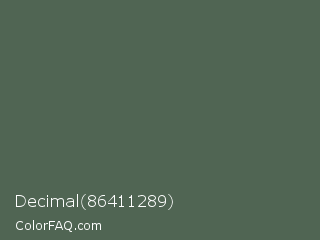 Decimal 86411289 Color is a normal green color and the nearest color is Feldgrau #4d5d53. Hex code #506553 and RGB value is rgb(80,101,83). In RGB color space, this color is composed of 31% red, 40% green, 33% blue, In CMYK color space, this color is composed of 21% cyan, 0% magenta, 18% yellow , 60% black , In HSL color space, this color has a hue angle of 129° , 12% saturation and 35% lightness.