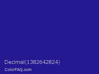 Decimal 1382642824 Color is a normal indigo color and the nearest color is Jacksons Purple #20208d. Hex code #241990 and RGB value is rgb(36,25,144). In RGB color space, this color is composed of 14% red, 10% green, 56% blue, In CMYK color space, this color is composed of 75% cyan, 83% magenta, 0% yellow , 44% black , In HSL color space, this color has a hue angle of 246° , 70% saturation and 33% lightness.