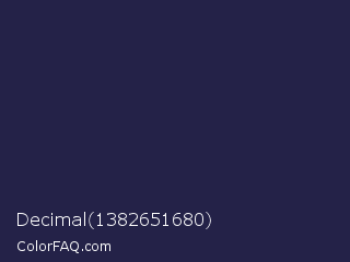Decimal 1382651680 Color is a very dark indigo color and the nearest color is Port Gore #251f4f. Hex code #242248 and RGB value is rgb(36,34,72). In RGB color space, this color is composed of 14% red, 13% green, 28% blue, In CMYK color space, this color is composed of 50% cyan, 53% magenta, 0% yellow , 72% black , In HSL color space, this color has a hue angle of 243° , 36% saturation and 21% lightness.