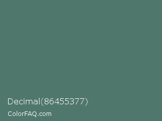 Decimal 86455377 Color is a normal green color and the nearest color is Cutty Sark #507672. Hex code #50776b and RGB value is rgb(80,119,107). In RGB color space, this color is composed of 31% red, 47% green, 42% blue, In CMYK color space, this color is composed of 33% cyan, 0% magenta, 10% yellow , 53% black , In HSL color space, this color has a hue angle of 162° , 20% saturation and 39% lightness.