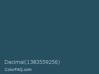 Decimal 1383559256 Color is a dark blue color and the nearest color is San Juan #304b6a. Hex code #255062 and RGB value is rgb(37,80,98). In RGB color space, this color is composed of 15% red, 31% green, 38% blue, In CMYK color space, this color is composed of 62% cyan, 18% magenta, 0% yellow , 62% black , In HSL color space, this color has a hue angle of 198° , 45% saturation and 26% lightness.