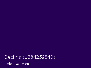 Decimal 1384259840 Color is a very dark violet color and the nearest color is Cherry Pie #2a0359. Hex code #260054 and RGB value is rgb(38,0,84). In RGB color space, this color is composed of 15% red, 0% green, 33% blue, In CMYK color space, this color is composed of 55% cyan, 100% magenta, 0% yellow , 67% black , In HSL color space, this color has a hue angle of 267° , 100% saturation and 16% lightness.