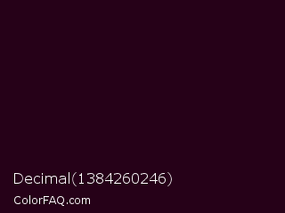 Decimal 1384260246 Color is a almost black magenta color and the nearest color is Jacaranda #2e0329. Hex code #260118 and RGB value is rgb(38,1,24). In RGB color space, this color is composed of 15% red, 0% green, 9% blue, In CMYK color space, this color is composed of 0% cyan, 97% magenta, 37% yellow , 85% black , In HSL color space, this color has a hue angle of 323° , 95% saturation and 8% lightness.