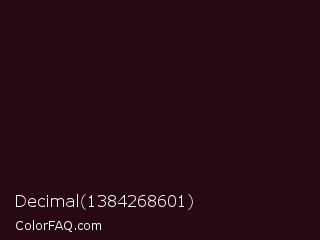 Decimal 1384268601 Color is a almost black rose color and the nearest color is Gondola #261414. Hex code #260913 and RGB value is rgb(38,9,19). In RGB color space, this color is composed of 15% red, 4% green, 7% blue, In CMYK color space, this color is composed of 0% cyan, 76% magenta, 50% yellow , 85% black , In HSL color space, this color has a hue angle of 339° , 62% saturation and 9% lightness.