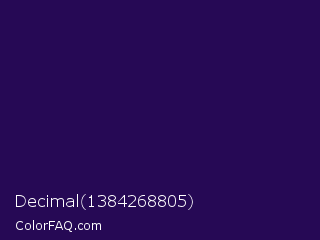 Decimal 1384268805 Color is a very dark violet color and the nearest color is Cherry Pie #2a0359. Hex code #260955 and RGB value is rgb(38,9,85). In RGB color space, this color is composed of 15% red, 4% green, 33% blue, In CMYK color space, this color is composed of 55% cyan, 89% magenta, 0% yellow , 67% black , In HSL color space, this color has a hue angle of 263° , 81% saturation and 18% lightness.