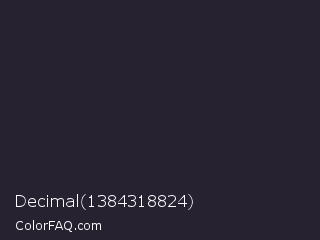 Decimal 1384318824 Color is a very dark indigo color and the nearest color is Bastille #292130. Hex code #262230 and RGB value is rgb(38,34,48). In RGB color space, this color is composed of 15% red, 13% green, 19% blue, In CMYK color space, this color is composed of 21% cyan, 29% magenta, 0% yellow , 81% black , In HSL color space, this color has a hue angle of 257° , 17% saturation and 16% lightness.