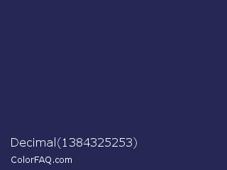 Decimal 1384325253 Color is a dark blue color and the nearest color is Cloud Burst #202e54. Hex code #262755 and RGB value is rgb(38,39,85). In RGB color space, this color is composed of 15% red, 15% green, 33% blue, In CMYK color space, this color is composed of 55% cyan, 54% magenta, 0% yellow , 67% black , In HSL color space, this color has a hue angle of 239° , 38% saturation and 24% lightness.