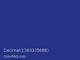 Decimal 1384335688 Color is a normal blue color and the nearest color is Bay Of Many #273a81. Hex code #263284 and RGB value is rgb(38,50,132). In RGB color space, this color is composed of 15% red, 20% green, 52% blue, In CMYK color space, this color is composed of 71% cyan, 62% magenta, 0% yellow , 48% black , In HSL color space, this color has a hue angle of 232° , 55% saturation and 33% lightness.