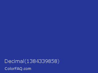 Decimal 1384339858 Color is a normal blue color and the nearest color is Blue Pigment #333399. Hex code #263698 and RGB value is rgb(38,54,152). In RGB color space, this color is composed of 15% red, 21% green, 60% blue, In CMYK color space, this color is composed of 75% cyan, 64% magenta, 0% yellow , 40% black , In HSL color space, this color has a hue angle of 232° , 60% saturation and 37% lightness.