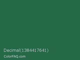 Decimal 1384417641 Color is a dark green color and the nearest color is Green Pea #1d6142. Hex code #266949 and RGB value is rgb(38,105,73). In RGB color space, this color is composed of 15% red, 41% green, 29% blue, In CMYK color space, this color is composed of 64% cyan, 0% magenta, 30% yellow , 59% black , In HSL color space, this color has a hue angle of 151° , 47% saturation and 28% lightness.