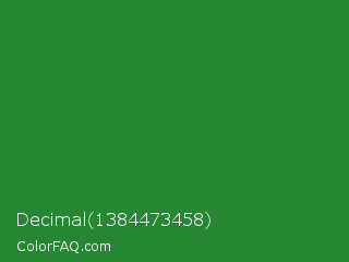 Decimal 1384473458 Color is a normal green color and the nearest color is Forest Green #228b22. Hex code #268634 and RGB value is rgb(38,134,52). In RGB color space, this color is composed of 15% red, 53% green, 20% blue, In CMYK color space, this color is composed of 72% cyan, 0% magenta, 61% yellow , 47% black , In HSL color space, this color has a hue angle of 129° , 56% saturation and 34% lightness.