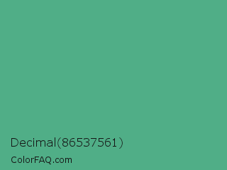 Decimal 86537561 Color is a normal green color and the nearest color is Mint #3eb489. Hex code #50ae87 and RGB value is rgb(80,174,135). In RGB color space, this color is composed of 31% red, 68% green, 53% blue, In CMYK color space, this color is composed of 54% cyan, 0% magenta, 22% yellow , 32% black , In HSL color space, this color has a hue angle of 155° , 37% saturation and 50% lightness.