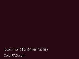 Decimal 1384682338 Color is a almost black rose color and the nearest color is Gondola #261414. Hex code #270712 and RGB value is rgb(39,7,18). In RGB color space, this color is composed of 15% red, 3% green, 7% blue, In CMYK color space, this color is composed of 0% cyan, 82% magenta, 54% yellow , 85% black , In HSL color space, this color has a hue angle of 339° , 70% saturation and 9% lightness.