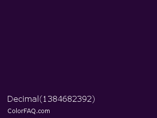Decimal 1384682392 Color is a very dark purple color and the nearest color is Violet #240a40. Hex code #270736 and RGB value is rgb(39,7,54). In RGB color space, this color is composed of 15% red, 3% green, 21% blue, In CMYK color space, this color is composed of 28% cyan, 87% magenta, 0% yellow , 79% black , In HSL color space, this color has a hue angle of 281° , 77% saturation and 12% lightness.