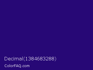 Decimal 1384683288 Color is a dark indigo color and the nearest color is Deep Blue #220878. Hex code #270876 and RGB value is rgb(39,8,118). In RGB color space, this color is composed of 15% red, 3% green, 46% blue, In CMYK color space, this color is composed of 67% cyan, 93% magenta, 0% yellow , 54% black , In HSL color space, this color has a hue angle of 257° , 87% saturation and 25% lightness.